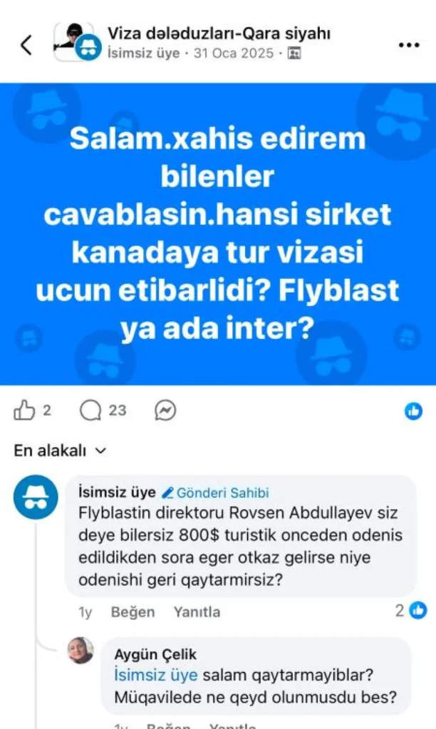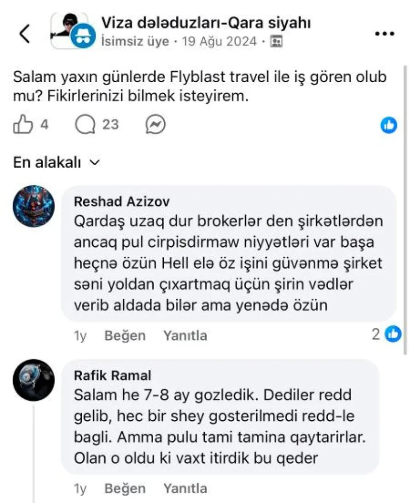 Sosial şəbəkələrdə vətəndaşların şikayətlərində qeyd olunur ki, Flyblast Travel Agency ilə müqavilə bağlayan şəxslər aylarla hətta illərlə süründürməçiliyə məruz qalır, proseslər süni şəkildə uzadılır və nəticədə bir çox hallarda viza alınmır. Bu isə ödəniş edilmiş xidmətin faktiki göstərilməməsi kimi qiymətləndirilir.